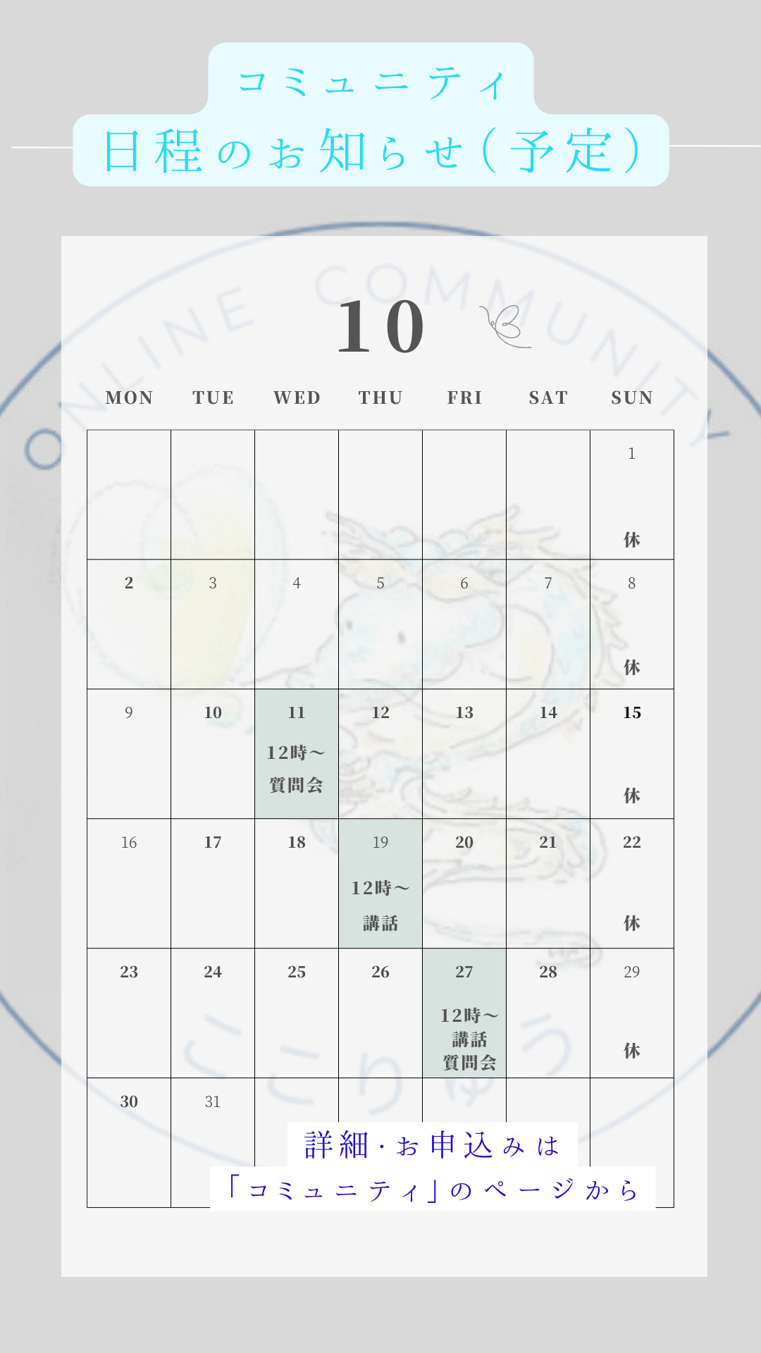 ※お仕事などのご都合がある方もいらっしゃいますので2ヶ月分の予定を更新していきます。少し先の日程になりますのであくまでも予定です。できる限り変更なく行いますが、やむを得ず変更になる場合は会員様に公式ラインからメッセージにてお知らせいたします。ご了承ください。